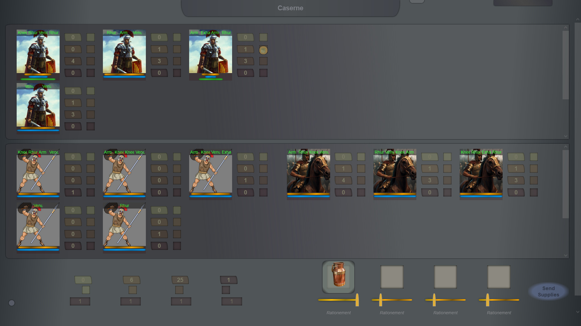 | - Troops Management We want to build the ultimate Strategist Haven. So Managing your troops is crucial if you want them to fight. Ration, Exhaustion and Intoxication are the 3 very basics you will have to handle. And you will have to pick the right dishes and checking carefully their virtues if you want your troops ready for the confrontation